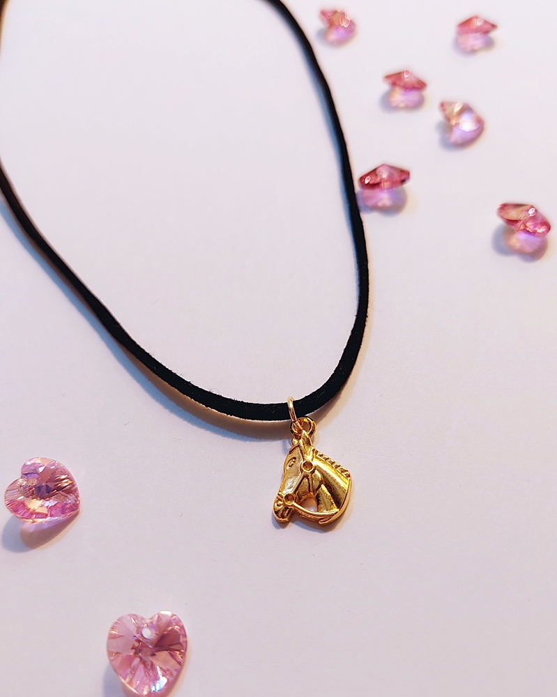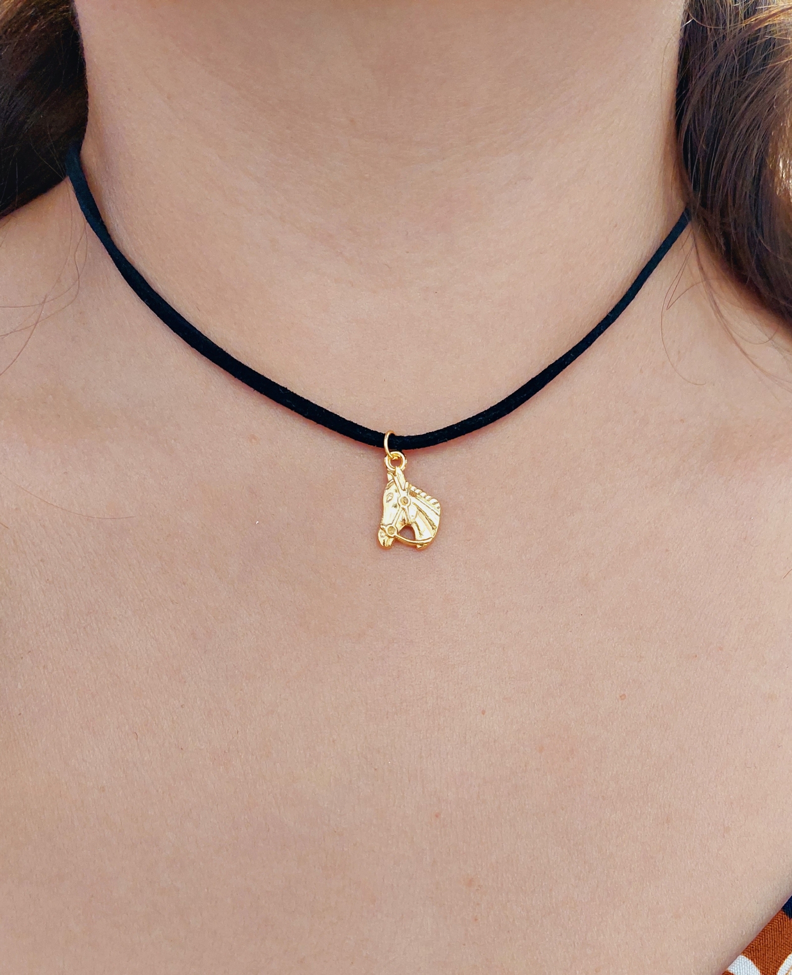 Material: cordón de gamuza, dije de chapa de oro. 45 cm. de largo.