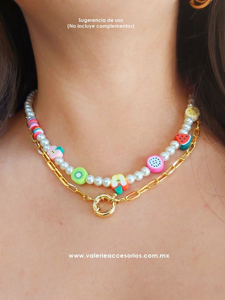 Perlas sintéticas y figuras de fimo. No incluye el collar dorado.